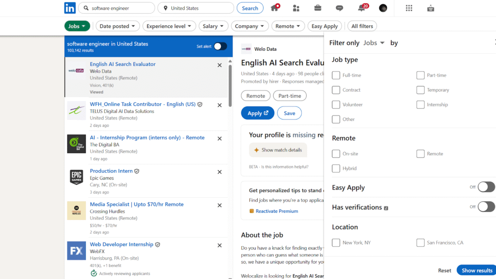 - Use all the search filters: LinkedIn provides a list of search filters to refine your job search process. Utilize filters like Job type, Location, Date and time, Experience level, Salary, and more.