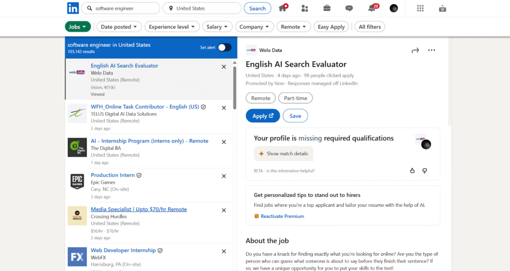 - Apply: You will see that several jobs have an Apply button instead of an Easy Apply. This will redirect you to a company’s website page with details regarding the job application and submission process.